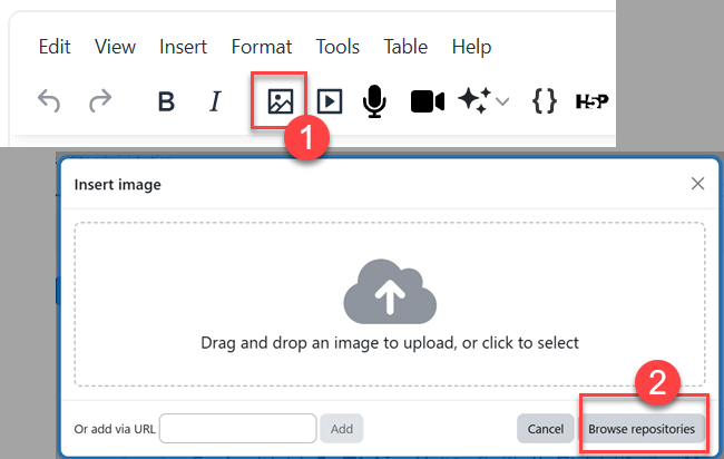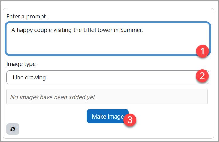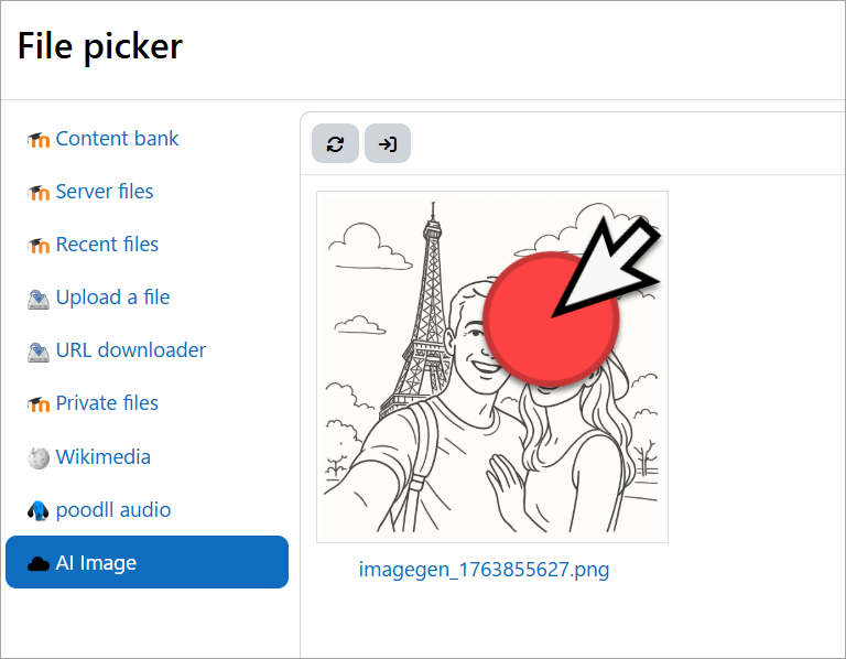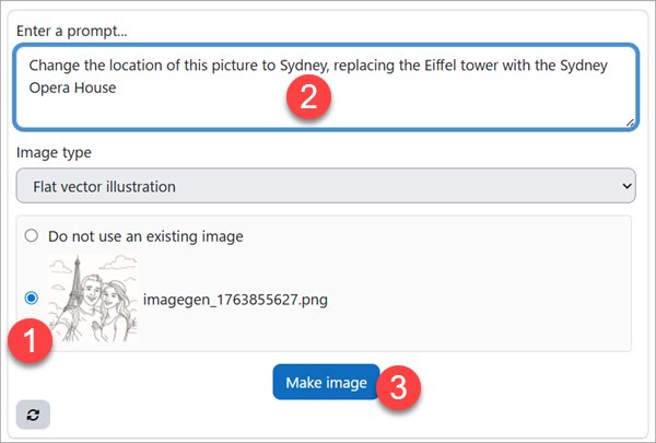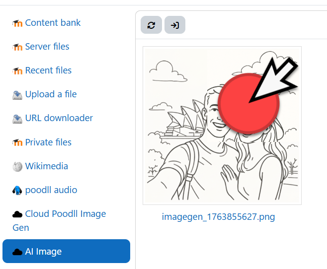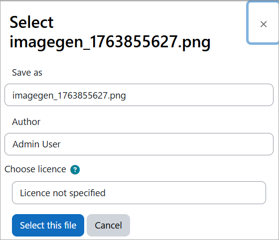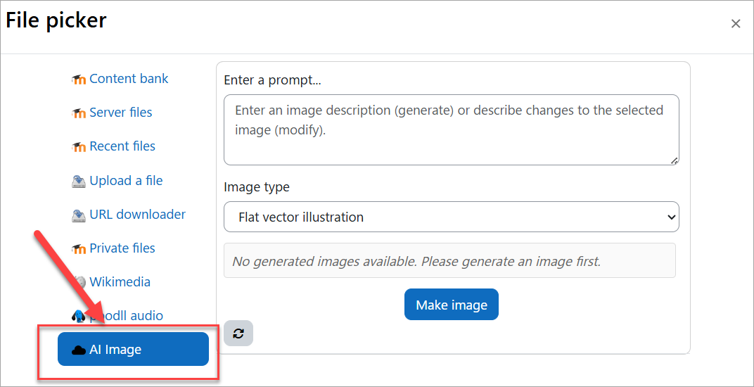 The AI Image repository allows you to generate an image from a text prompt, or to edit an existing image using a text prompt. As a repository plugin it is accessed from the repositories via the HTML editor "insert image" dialog. Or via the Moodle file manager.