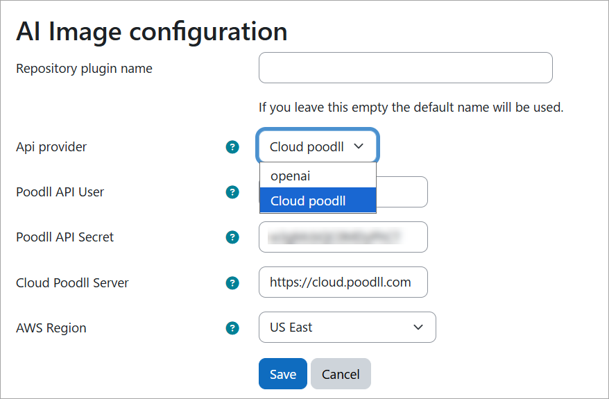 If you have a Poodll account, choose "Cloud Poodll" and enter your API user and secret here.