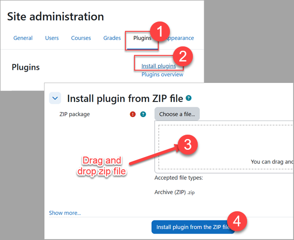 This is the recommended method. Visit your site's Site administration -> Plugins page and choose to "Install Plugins." Drag and drop the zip file you downloaded and follow the steps to install it.